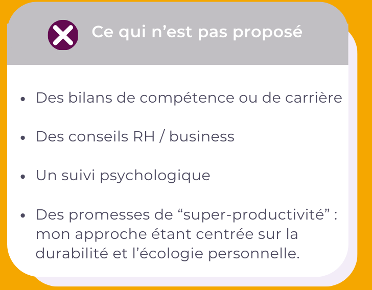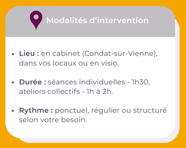 Sur mes méthodes d'accompagnement, les différentes applications, les bienfaits,... n'hésitez pas à consulter mon site internet dédié aux particuliers!