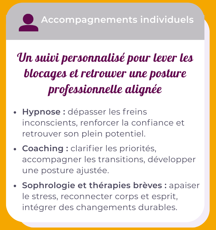 Accompagnements individuels et collectifs pour les professionnels en quête de sens, d’équilibre et d’efficacité durable.